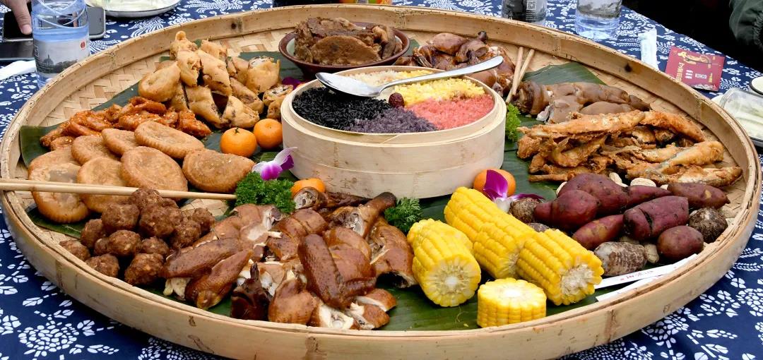 表演過后,為家人精心準(zhǔn)備的筵席,在塔山之下、漓江之畔美味開席。鄰里們相對(duì)而坐,別具一格的民族美食——簸箕宴擺上餐桌,壯鄉(xiāng)美味五色糯米飯,浸著玫瑰香氣的豉油雞,炸得酥脆的原生態(tài)漓江魚,肥而不膩的荔浦芋扣肉.......