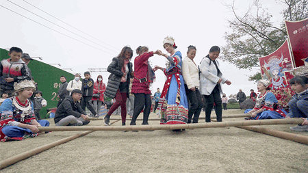 上午11時(shí),業(yè)主們陸續(xù)到達(dá),身穿民族服飾的少女合著悠揚(yáng)民樂跳起竹竿舞,喜迎八方來(lái)客。