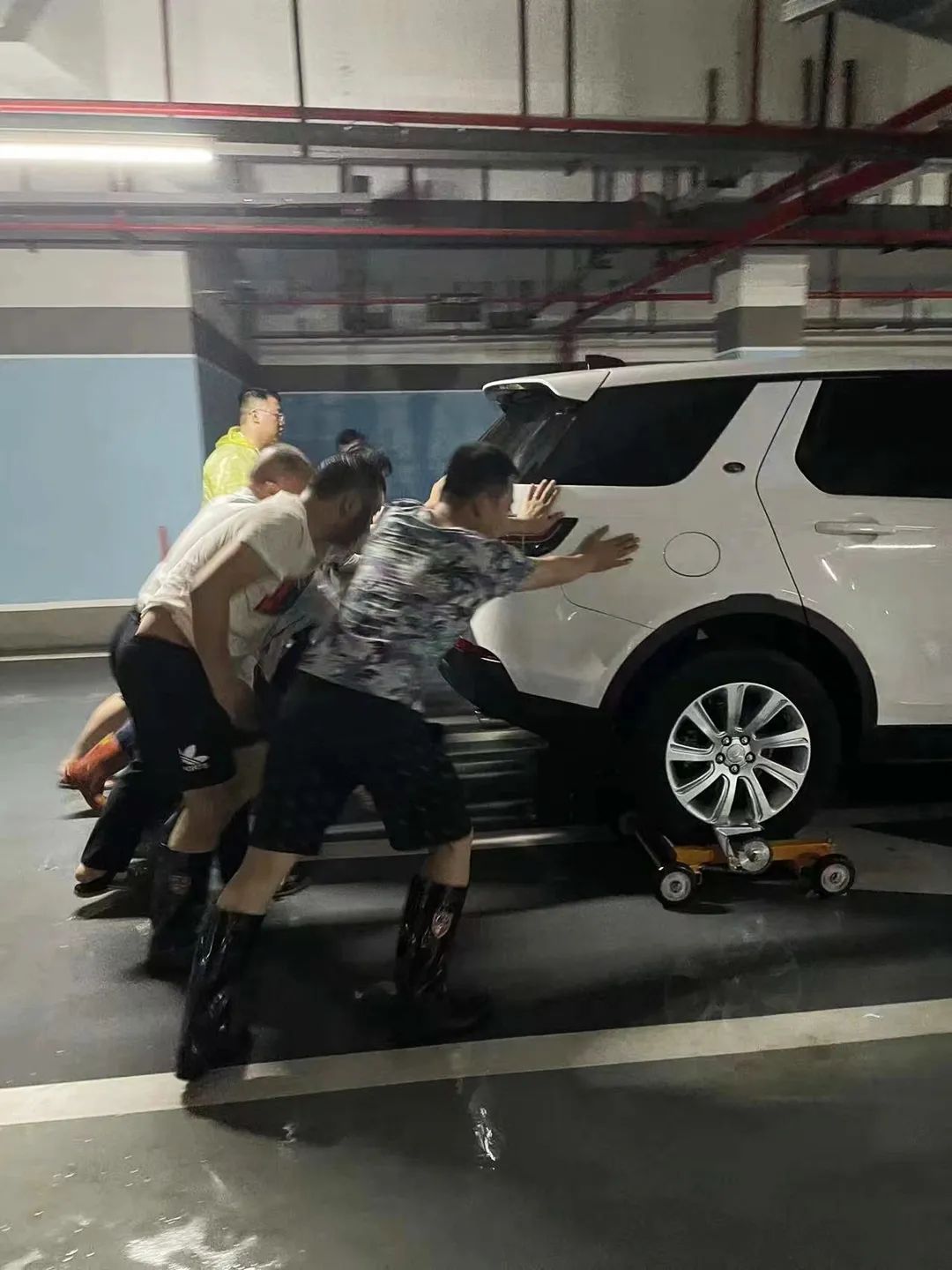 面對即將到來的汛情,物業(yè)人員第一時間拉起了警戒線,引導(dǎo)業(yè)主車輛進(jìn)出。眼見著水位越來越深,雨越下越大,全員集體行動,協(xié)助車主移車。有的車主聯(lián)系不上,物業(yè)團(tuán)隊便果斷冒雨采用移車器移車,從下午一直忙碌到晚上九點多,成功將所有車輛轉(zhuǎn)移至安全區(qū)域,力保業(yè)主們的愛車不受損失。