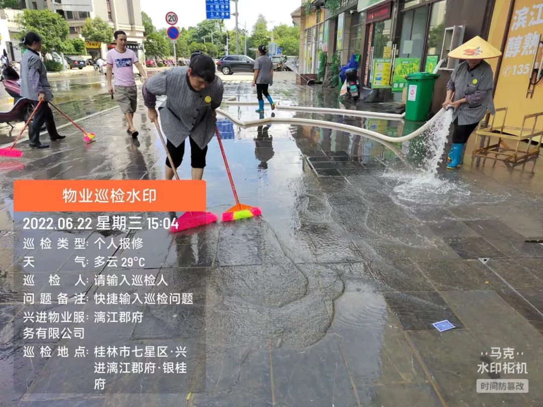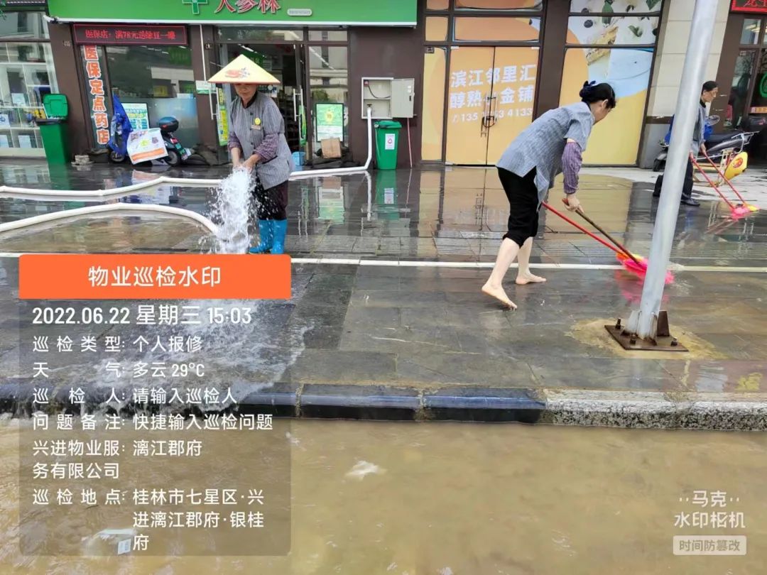 6月22日,漓江桂林城區(qū)河段出現(xiàn)超警2米左右洪水,超2019年最高水位。面對此次特大汛情,集團(tuán)領(lǐng)導(dǎo)班子高度重視,親臨現(xiàn)場指導(dǎo),工程部、物業(yè)及商業(yè)積極聯(lián)動互通,各項目負(fù)責(zé)人冒著雷暴天氣緊急趕往現(xiàn)場指揮。