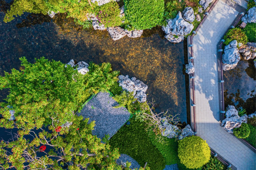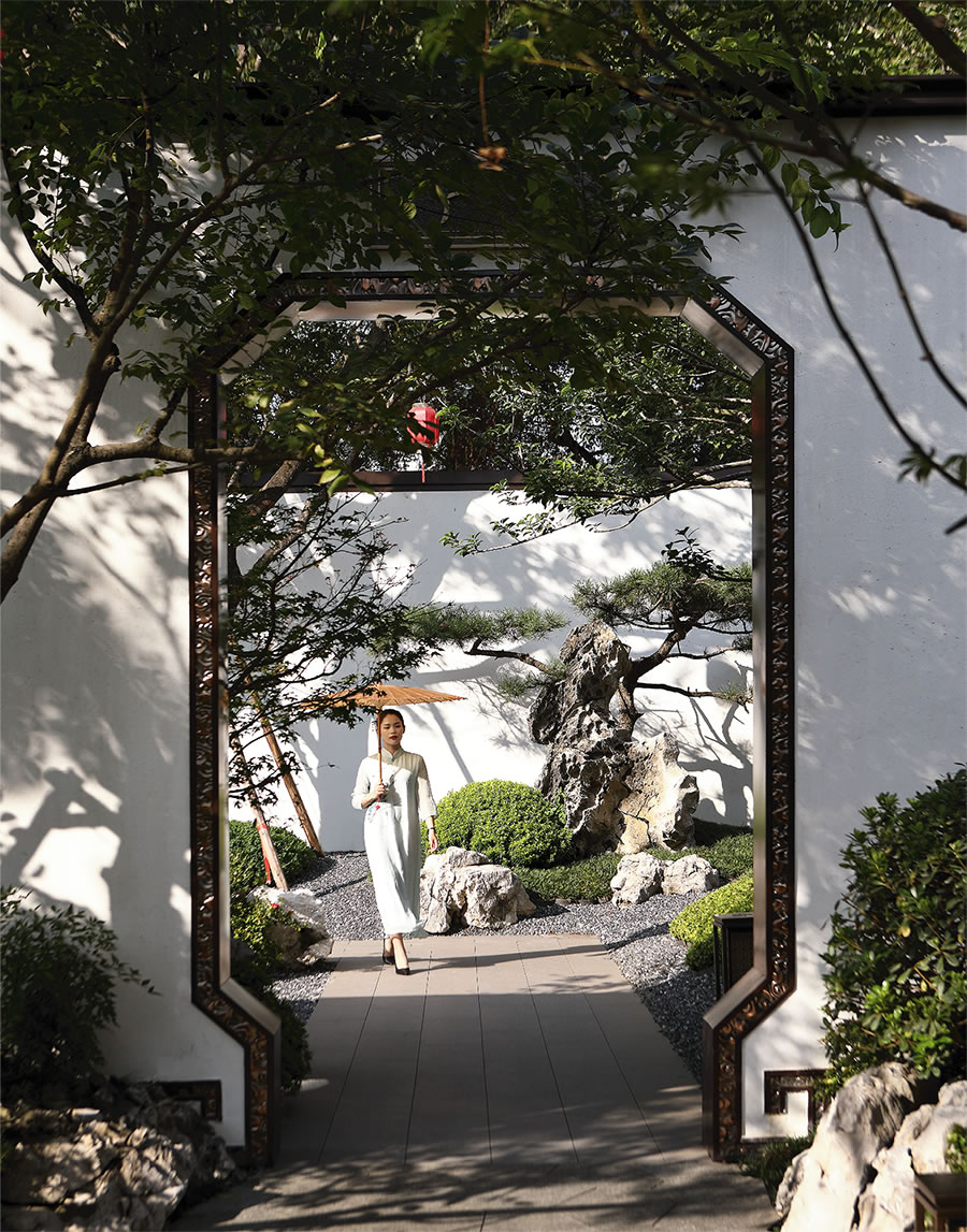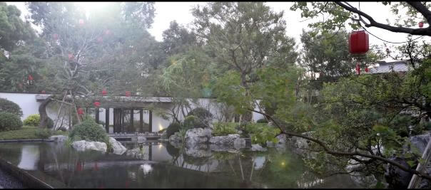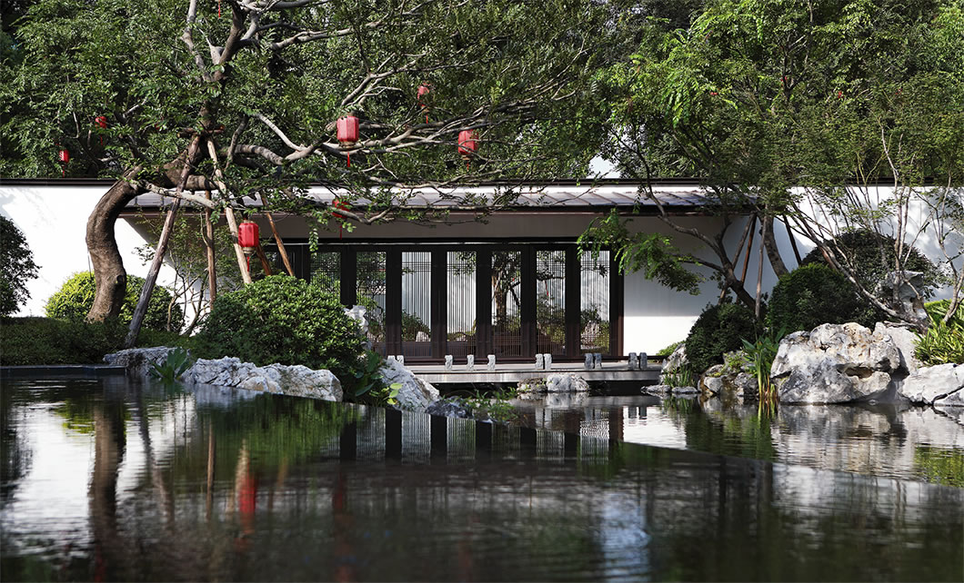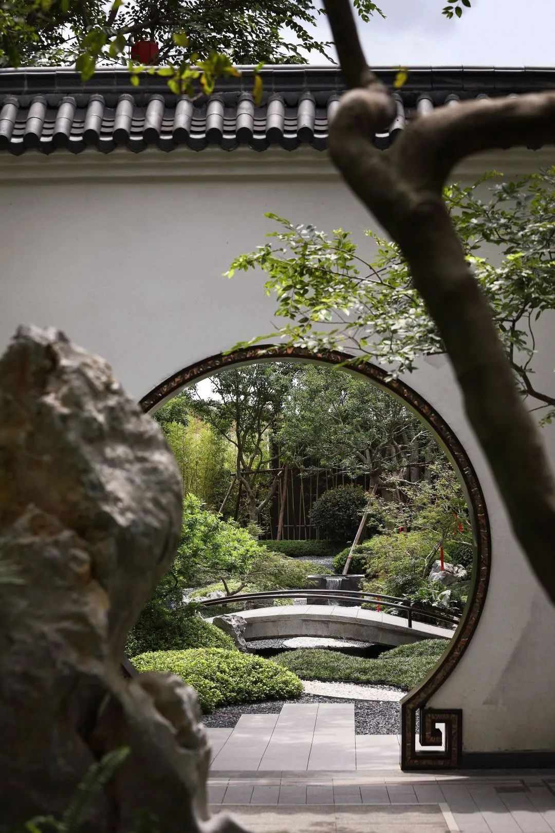 園林設(shè)計在傳承中國蘇州園林經(jīng)典和嚴肅規(guī)制的同時融入日本枯山水意境、精心考究照壁、水池、亭臺等元素,做到動靜相合、高地相輔、遠近融通。
