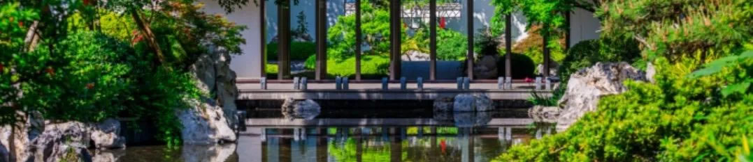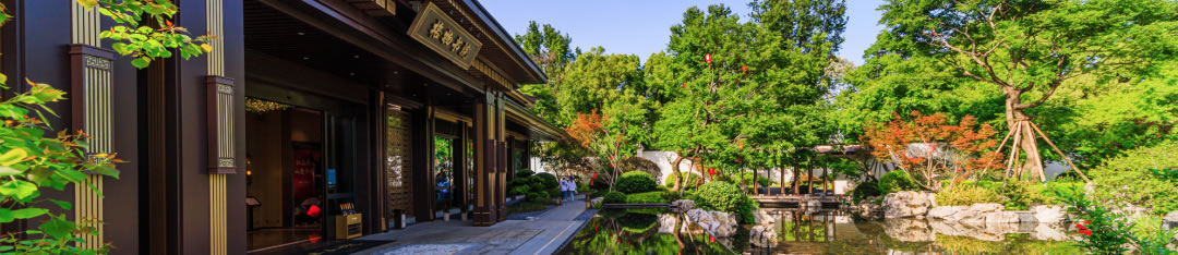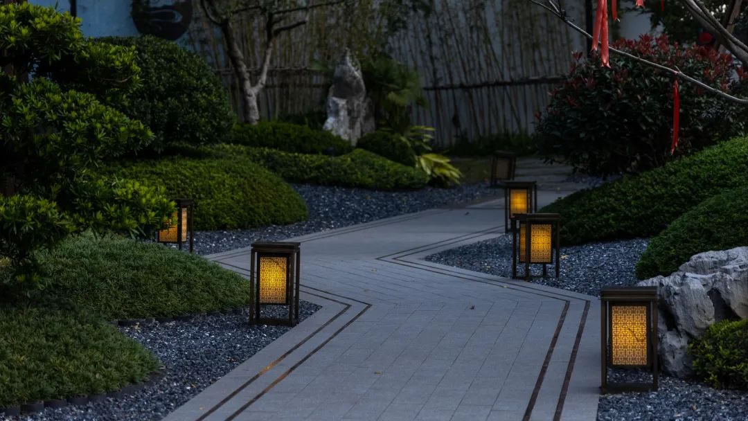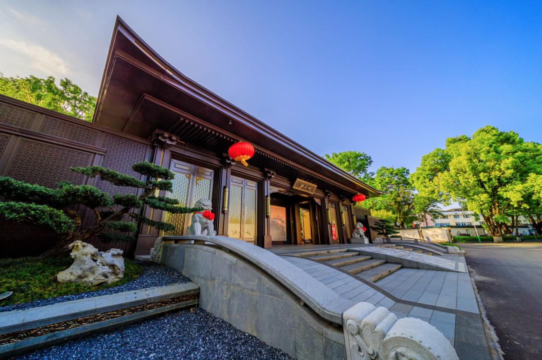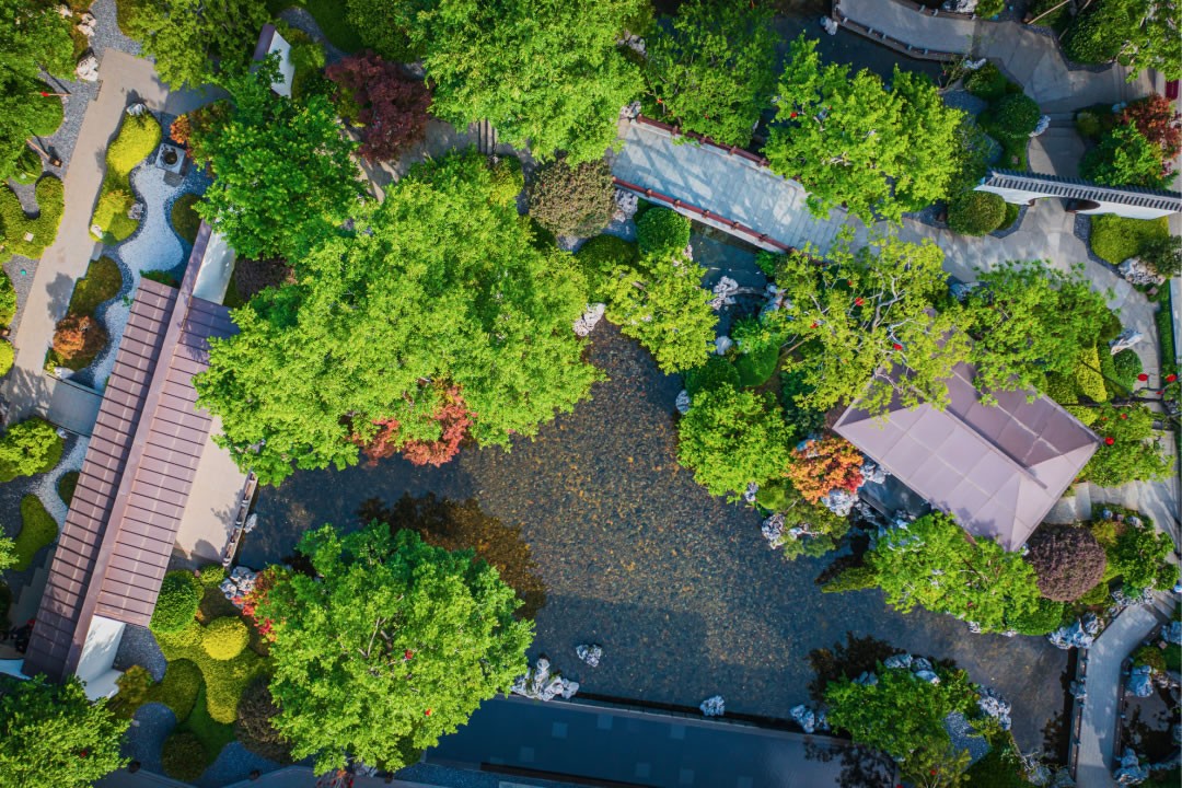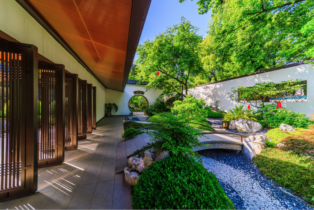 園林設(shè)計在傳承中國蘇州園林經(jīng)典和嚴肅規(guī)制的同時融入日本枯山水意境、精心考究照壁、水池、亭臺等元素,做到動靜相合、高地相輔、遠近融通。