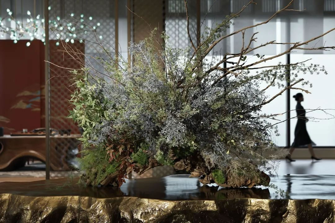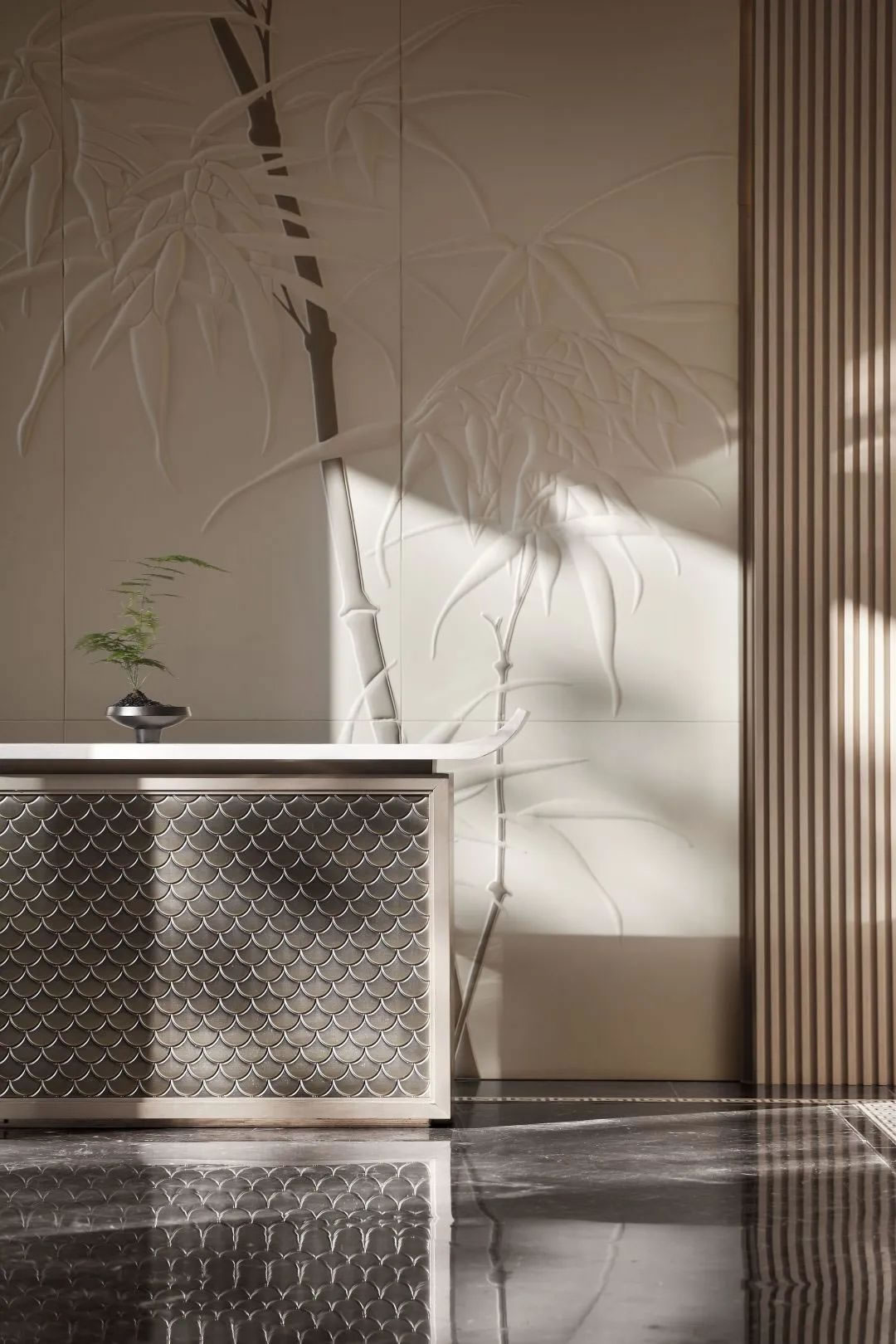 同時地面折射出空間的倒景,將空間內(nèi)拔萃的竹林畫像、日耀山影以及金屬元素,共匯于一界之間。