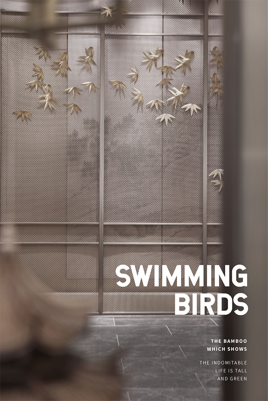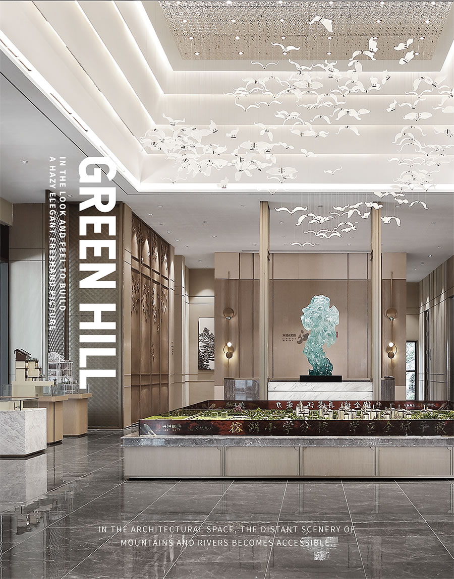 關(guān)于示范區(qū)天花構(gòu)造上,江山樾巧借中式傳統(tǒng)古亭的設(shè)計理念,將頂梁堆疊伸展于天花之上,營造出一方天地。古亭下方,盤旋一方飛鳥,栩栩如生,似簾虛風清花竹靜,時有鸕鶿相對鳴來點破、一泓澄綠。